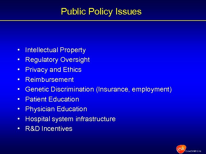 Public Policy Issues • • • Intellectual Property Regulatory Oversight Privacy and Ethics Reimbursement Genetic Discrimination (Insurance, employment) Patient Education Physician Education Hospital system infrastructure R&D Incentives