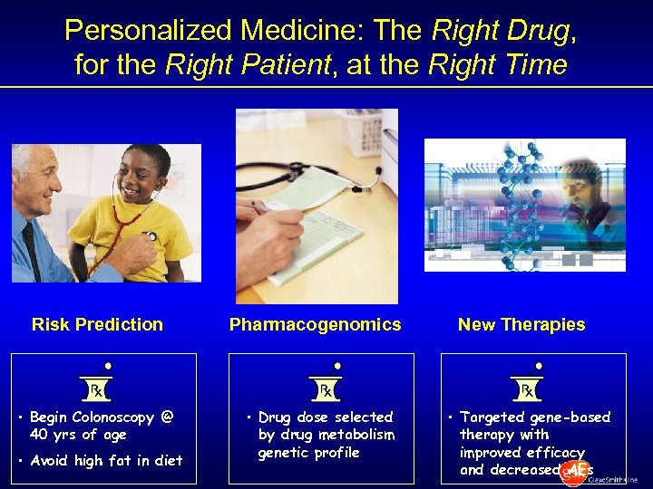 Personalized Medicine: The Right Drug, for the Right Patient, at the Right Time Risk Prediction • Begin Colonoscopy @ 40 yrs of age • Avoid high fat in diet Pharmacogenomics • Drug dose selected by drug metabolism genetic profile New Therapies • Targeted gene-based therapy with improved efficacy and decreased AEs