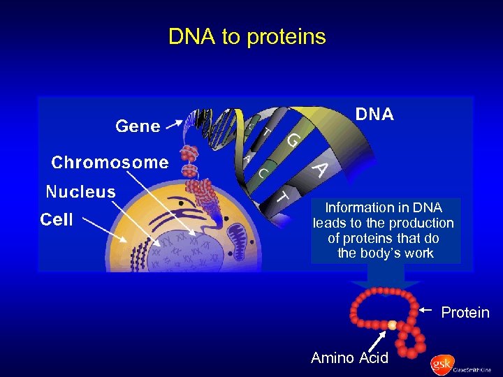 DNA to proteins Information in DNA leads to the production of proteins that do the body’s work Protein Amino Acid