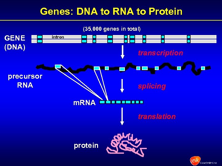 Genes: DNA to RNA to Protein (35, 000 genes in total) GENE (DNA) intron transcription precursor RNA splicing m. RNA translation protein