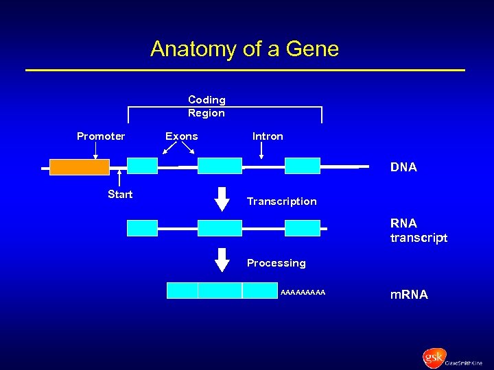 Anatomy of a Gene Coding Region Promoter Exons Intron DNA Start Transcription RNA transcript Processing AAAAA m. RNA