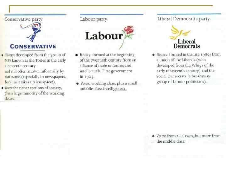 The party system l The British democratic system depends on political parties, and there has been a party system of some kind since the 17 th century. The political parties choose candidates in elections. The party which wins the majority of seats forms the Government and its leader usually becomes Prime Minister. The largest minority party becomes the Opposition.