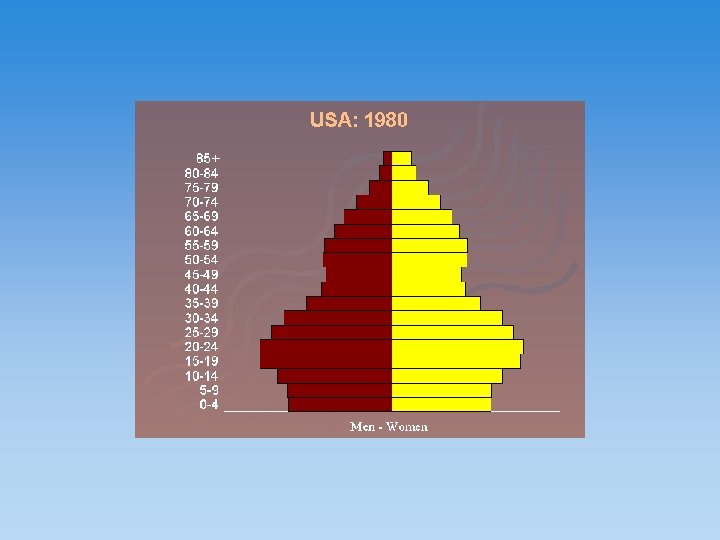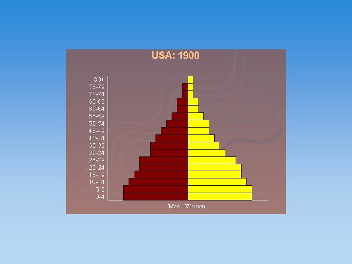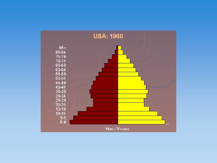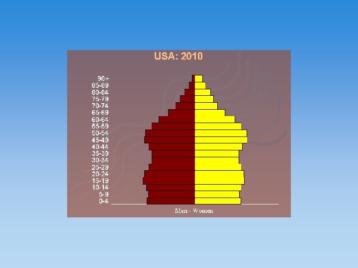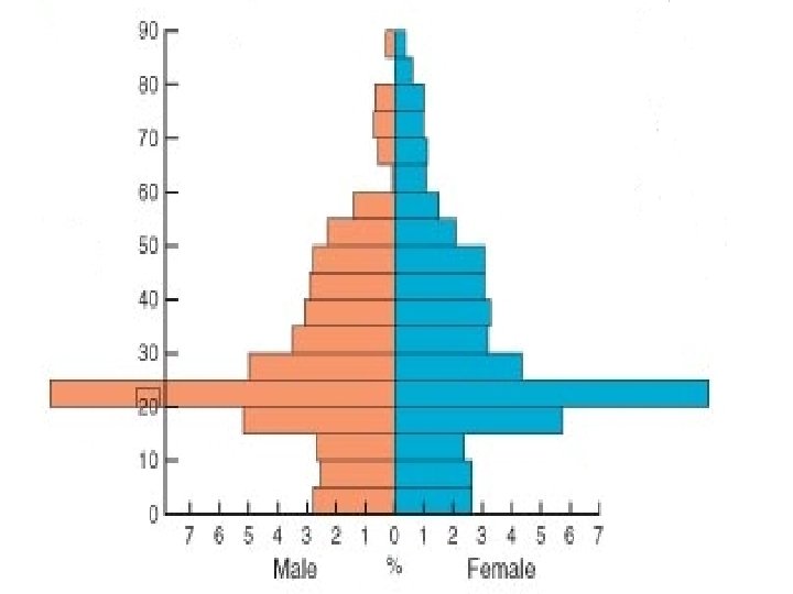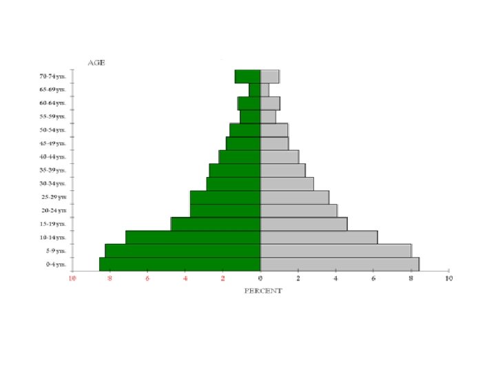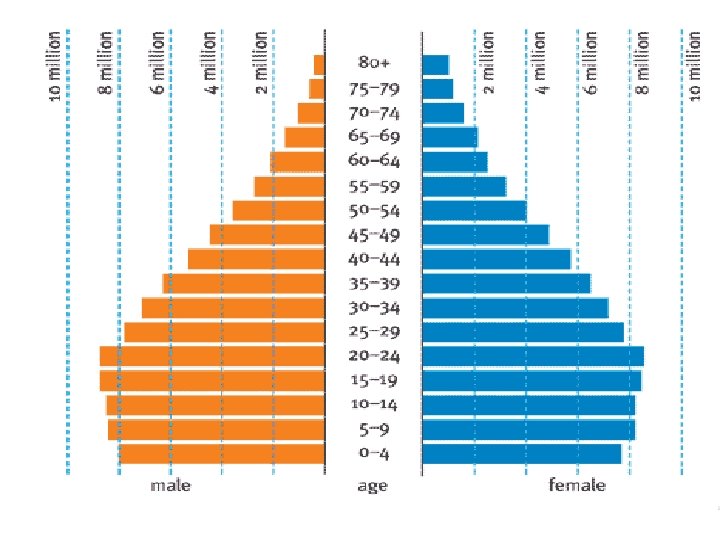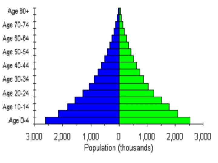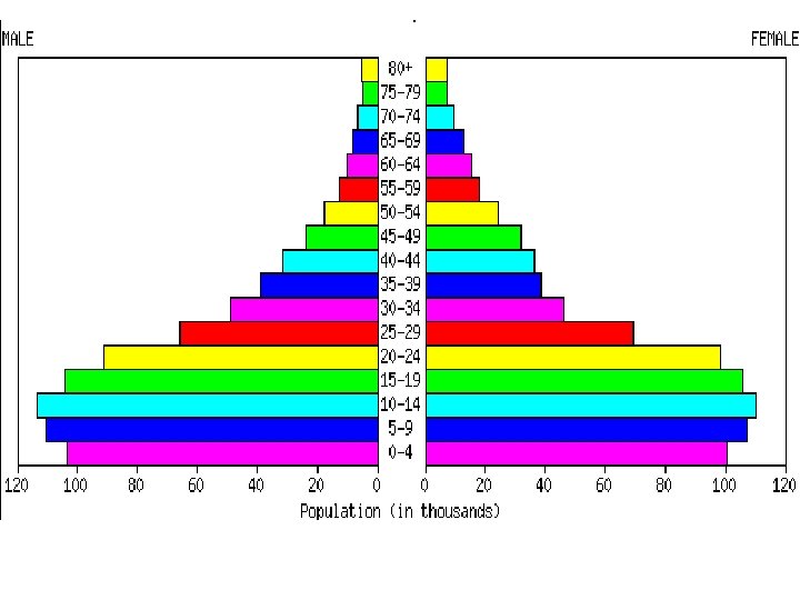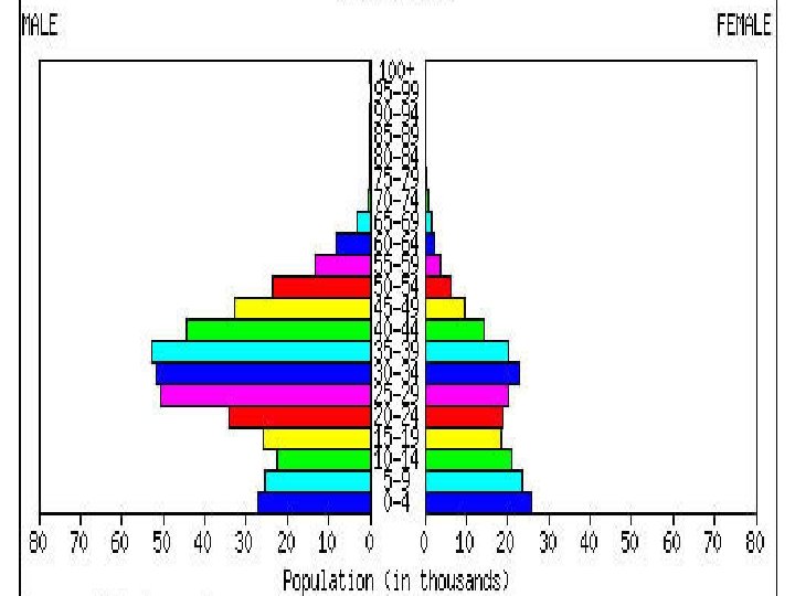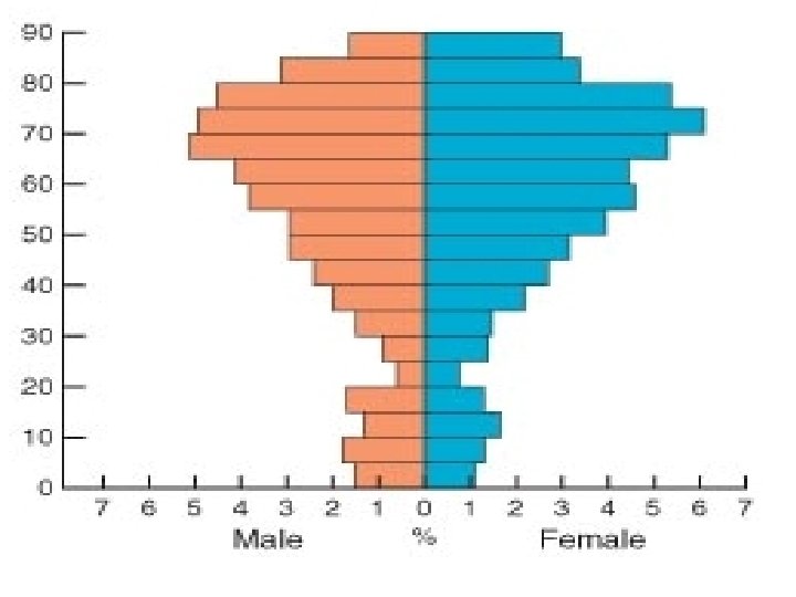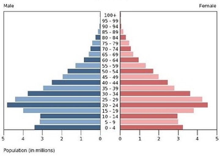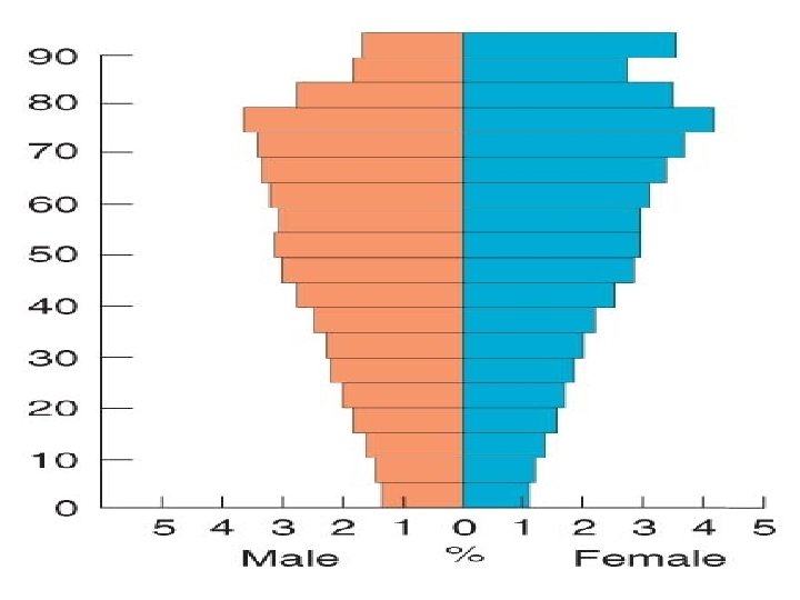 The population pyramid displays the age and sex structure of a country or given area OLD DEPENDANTS Population in Five Year Age bands ECONOMICALLY ACTIVE YOUNG DEPENDANTS MALES To the left Usually, but not always, in % to make for easier comparisons between countries FEMALES To the right