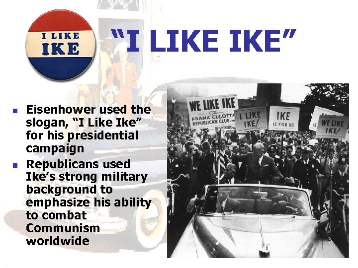 “I LIKE IKE” n n Eisenhower used the slogan, “I Like Ike” for his presidential campaign Republicans used Ike’s strong military background to emphasize his ability to combat Communism worldwide