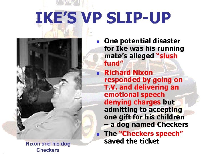 IKE’S VP SLIP-UP n n n Nixon and his dog Checkers One potential disaster for Ike was his running mate’s alleged “slush fund” Richard Nixon responded by going on T. V. and delivering an emotional speech denying charges but admitting to accepting one gift for his children – a dog named Checkers The “Checkers speech” saved the ticket