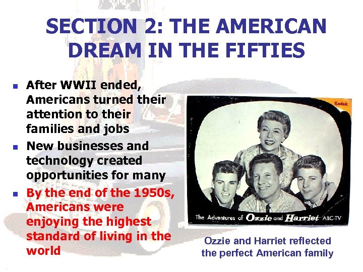 SECTION 2: THE AMERICAN DREAM IN THE FIFTIES n n n After WWII ended, Americans turned their attention to their families and jobs New businesses and technology created opportunities for many By the end of the 1950 s, Americans were enjoying the highest standard of living in the world Ozzie and Harriet reflected the perfect American family