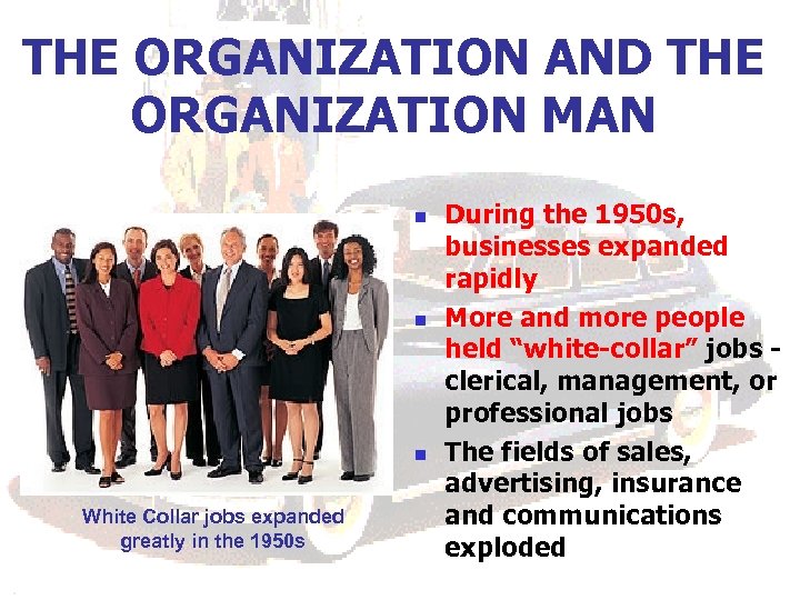 THE ORGANIZATION AND THE ORGANIZATION MAN n n n White Collar jobs expanded greatly in the 1950 s During the 1950 s, businesses expanded rapidly More and more people held “white-collar” jobs clerical, management, or professional jobs The fields of sales, advertising, insurance and communications exploded
