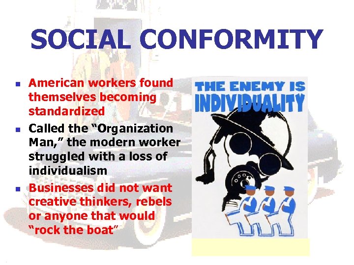 SOCIAL CONFORMITY n n n American workers found themselves becoming standardized Called the “Organization Man, ” the modern worker struggled with a loss of individualism Businesses did not want creative thinkers, rebels or anyone that would “rock the boat”