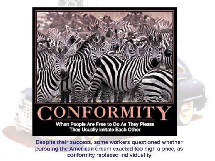 Despite their success, some workers questioned whether pursuing the American dream exacted too high a price, as conformity replaced individuality
