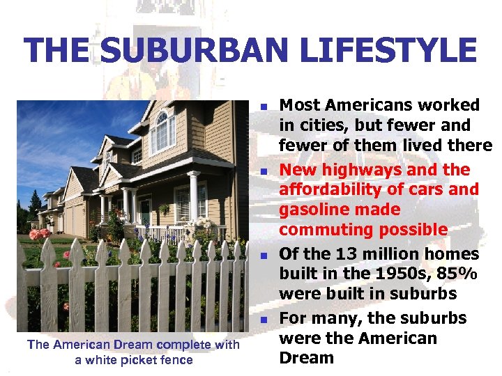 THE SUBURBAN LIFESTYLE n n The American Dream complete with a white picket fence Most Americans worked in cities, but fewer and fewer of them lived there New highways and the affordability of cars and gasoline made commuting possible Of the 13 million homes built in the 1950 s, 85% were built in suburbs For many, the suburbs were the American Dream