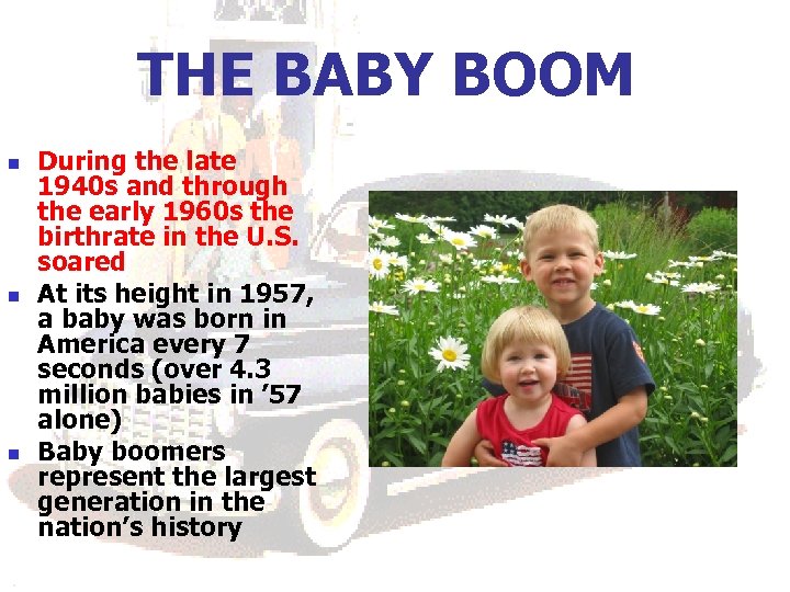 THE BABY BOOM n n n During the late 1940 s and through the early 1960 s the birthrate in the U. S. soared At its height in 1957, a baby was born in America every 7 seconds (over 4. 3 million babies in ’ 57 alone) Baby boomers represent the largest generation in the nation’s history