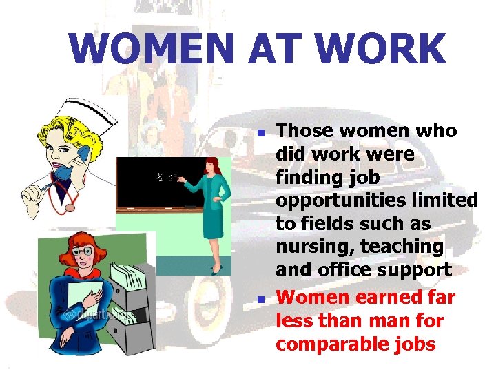 WOMEN AT WORK n n Those women who did work were finding job opportunities limited to fields such as nursing, teaching and office support Women earned far less than man for comparable jobs