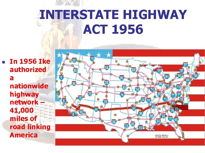INTERSTATE HIGHWAY ACT 1956 n In 1956 Ike authorized a nationwide highway network – 41, 000 miles of road linking America