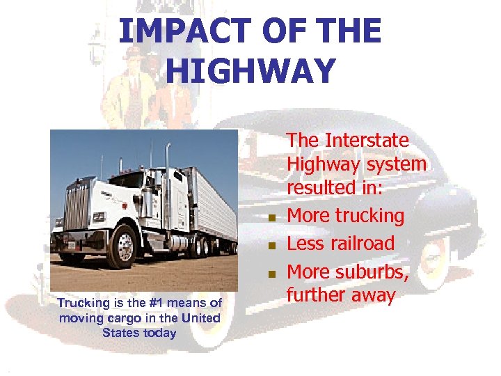 IMPACT OF THE HIGHWAY n n n Trucking is the #1 means of moving cargo in the United States today The Interstate Highway system resulted in: More trucking Less railroad More suburbs, further away