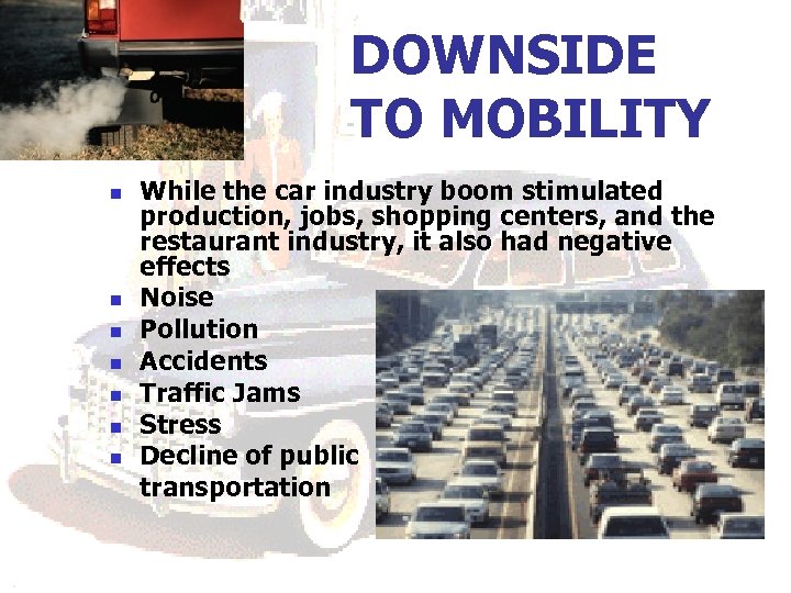 DOWNSIDE TO MOBILITY n n n n While the car industry boom stimulated production, jobs, shopping centers, and the restaurant industry, it also had negative effects Noise Pollution Accidents Traffic Jams Stress Decline of public transportation