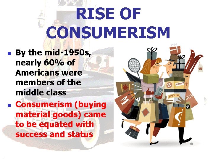 RISE OF CONSUMERISM n n By the mid-1950 s, nearly 60% of Americans were members of the middle class Consumerism (buying material goods) came to be equated with success and status