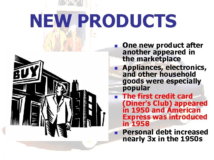 NEW PRODUCTS n n One new product after another appeared in the marketplace Appliances, electronics, and other household goods were especially popular The first credit card (Diner’s Club) appeared in 1950 and American Express was introduced in 1958 Personal debt increased nearly 3 x in the 1950 s
