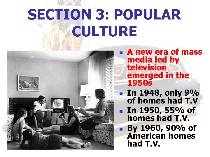 SECTION 3: POPULAR CULTURE n n A new era of mass media led by television emerged in the 1950 s In 1948, only 9% of homes had T. V In 1950, 55% of homes had T. V. By 1960, 90% of American homes had T. V.