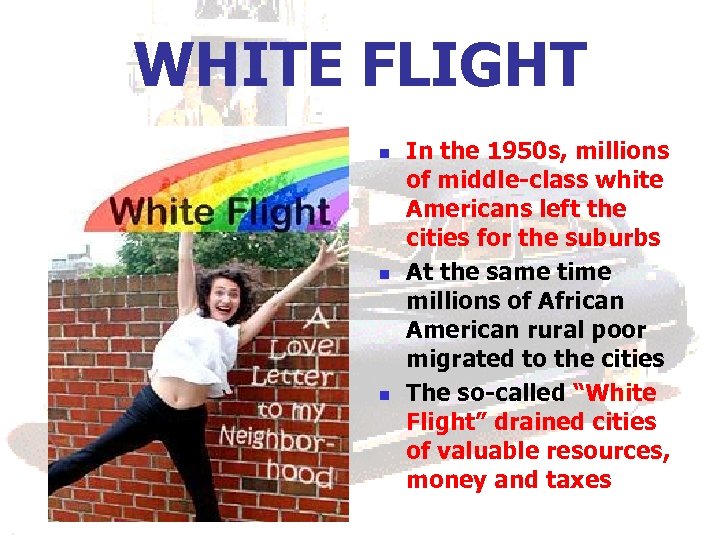 WHITE FLIGHT n n n In the 1950 s, millions of middle-class white Americans left the cities for the suburbs At the same time millions of African American rural poor migrated to the cities The so-called “White Flight” drained cities of valuable resources, money and taxes