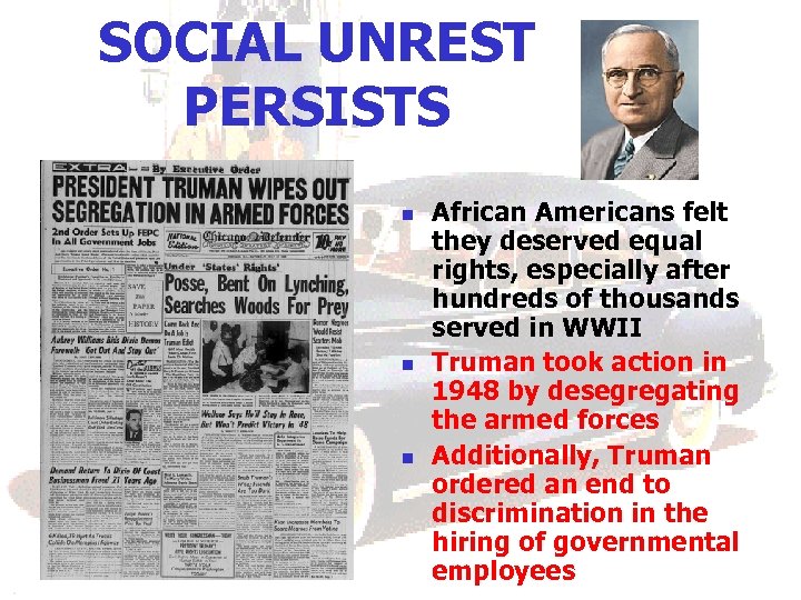 SOCIAL UNREST PERSISTS n n n African Americans felt they deserved equal rights, especially after hundreds of thousands served in WWII Truman took action in 1948 by desegregating the armed forces Additionally, Truman ordered an end to discrimination in the hiring of governmental employees