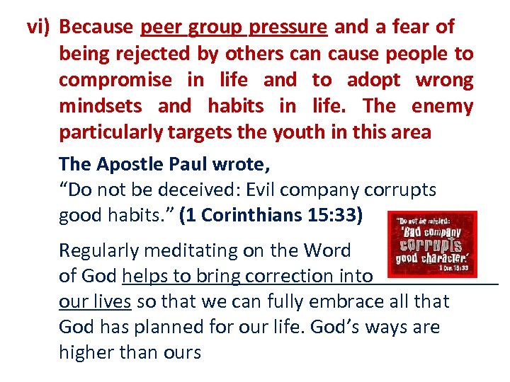 vi) Because peer group pressure and a fear of being rejected by others can cause people to compromise in life and to adopt wrong mindsets and habits in life. The enemy particularly targets the youth in this area The Apostle Paul wrote, “Do not be deceived: Evil company corrupts good habits. ” (1 Corinthians 15: 33) Regularly meditating on the Word of God helps to bring correction into our lives so that we can fully embrace all that God has planned for our life. God’s ways are higher than ours