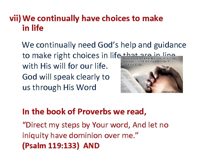 vii) We continually have choices to make in life We continually need God’s help and guidance to make right choices in life that are in line with His will for our life. God will speak clearly to us through His Word In the book of Proverbs we read, “Direct my steps by Your word, And let no iniquity have dominion over me. ” (Psalm 119: 133) AND
