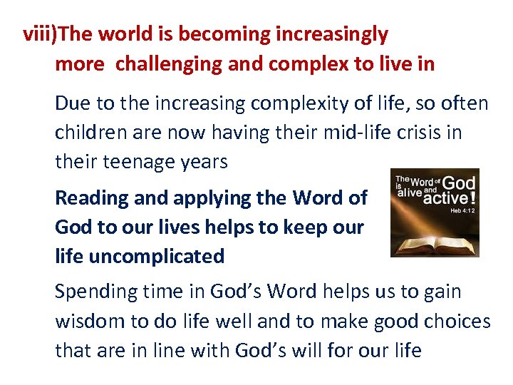 viii)The world is becoming increasingly more challenging and complex to live in Due to the increasing complexity of life, so often children are now having their mid-life crisis in their teenage years Reading and applying the Word of God to our lives helps to keep our life uncomplicated Spending time in God’s Word helps us to gain wisdom to do life well and to make good choices that are in line with God’s will for our life