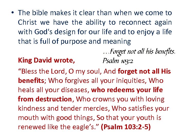 • The bible makes it clear than when we come to Christ we have the ability to reconnect again with God's design for our life and to enjoy a life that is full of purpose and meaning King David wrote, “Bless the Lord, O my soul, And forget not all His benefits; Who forgives all your iniquities, Who heals all your diseases, who redeems your life from destruction, Who crowns you with loving kindness and tender mercies, Who satisfies your mouth with good things, So that your youth is renewed like the eagle’s. ” (Psalm 103: 2 -5)