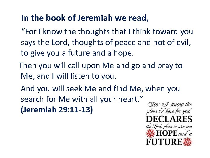 In the book of Jeremiah we read, “For I know the thoughts that I think toward you says the Lord, thoughts of peace and not of evil, to give you a future and a hope. Then you will call upon Me and go and pray to Me, and I will listen to you. And you will seek Me and find Me, when you search for Me with all your heart. ” (Jeremiah 29: 11 -13)
