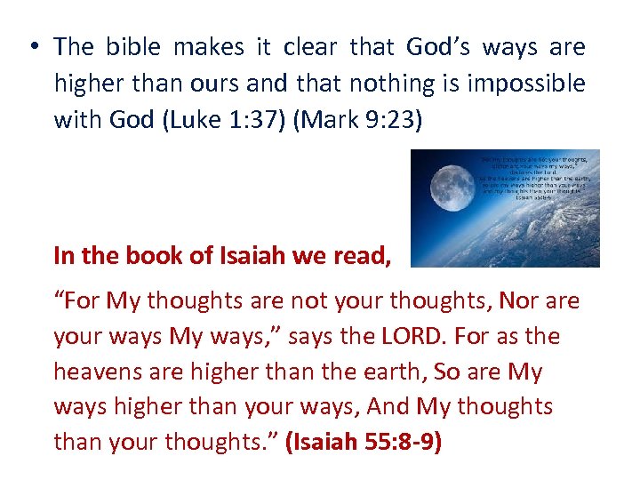 • The bible makes it clear that God’s ways are higher than ours and that nothing is impossible with God (Luke 1: 37) (Mark 9: 23) In the book of Isaiah we read, “For My thoughts are not your thoughts, Nor are your ways My ways, ” says the LORD. For as the heavens are higher than the earth, So are My ways higher than your ways, And My thoughts than your thoughts. ” (Isaiah 55: 8 -9)
