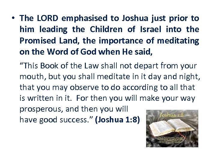 • The LORD emphasised to Joshua just prior to him leading the Children of Israel into the Promised Land, the importance of meditating on the Word of God when He said, “This Book of the Law shall not depart from your mouth, but you shall meditate in it day and night, that you may observe to do according to all that is written in it. For then you will make your way prosperous, and then you will have good success. ” (Joshua 1: 8)