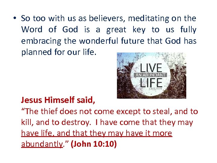 • So too with us as believers, meditating on the Word of God is a great key to us fully embracing the wonderful future that God has planned for our life. Jesus Himself said, “The thief does not come except to steal, and to kill, and to destroy. I have come that they may have life, and that they may have it more abundantly. ” (John 10: 10)