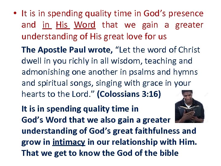 • It is in spending quality time in God’s presence and in His Word that we gain a greater understanding of His great love for us The Apostle Paul wrote, “Let the word of Christ dwell in you richly in all wisdom, teaching and admonishing one another in psalms and hymns and spiritual songs, singing with grace in your hearts to the Lord. ” (Colossians 3: 16) It is in spending quality time in God’s Word that we also gain a greater understanding of God’s great faithfulness and grow in intimacy in our relationship with Him. That we get to know the God of the bible