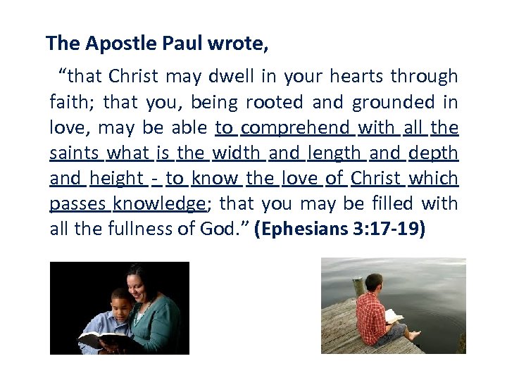The Apostle Paul wrote, “that Christ may dwell in your hearts through faith; that you, being rooted and grounded in love, may be able to comprehend with all the saints what is the width and length and depth and height - to know the love of Christ which passes knowledge; that you may be filled with all the fullness of God. ” (Ephesians 3: 17 -19)