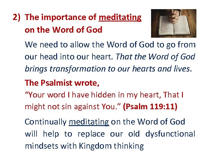 2) The importance of meditating on the Word of God We need to allow the Word of God to go from our head into our heart. That the Word of God brings transformation to our hearts and lives. The Psalmist wrote, “Your word I have hidden in my heart, That I might not sin against You. ” (Psalm 119: 11) Continually meditating on the Word of God will help to replace our old dysfunctional mindsets with Kingdom thinking