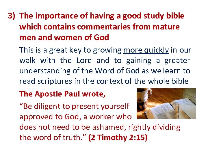 3) The importance of having a good study bible which contains commentaries from mature men and women of God This is a great key to growing more quickly in our walk with the Lord and to gaining a greater understanding of the Word of God as we learn to read scriptures in the context of the whole bible The Apostle Paul wrote, “Be diligent to present yourself approved to God, a worker who does not need to be ashamed, rightly dividing the word of truth. ” (2 Timothy 2: 15)