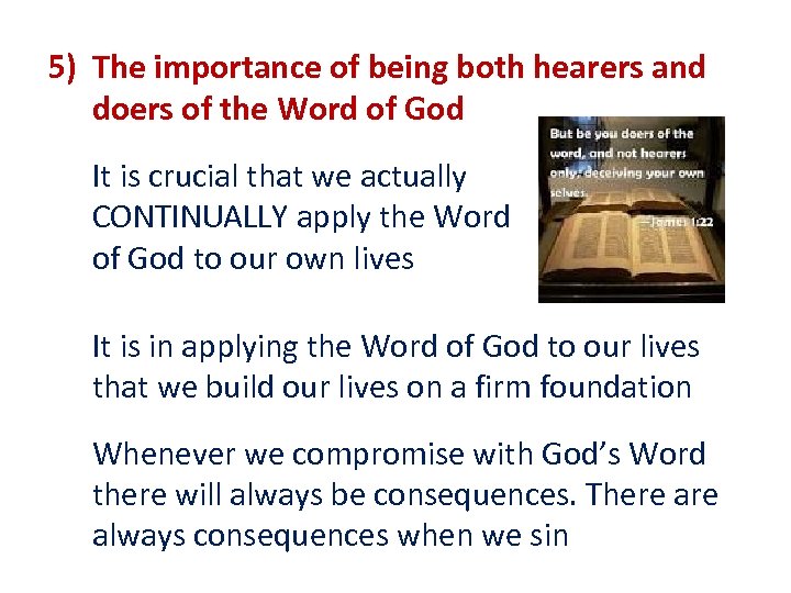 5) The importance of being both hearers and doers of the Word of God It is crucial that we actually CONTINUALLY apply the Word of God to our own lives It is in applying the Word of God to our lives that we build our lives on a firm foundation Whenever we compromise with God’s Word there will always be consequences. There always consequences when we sin