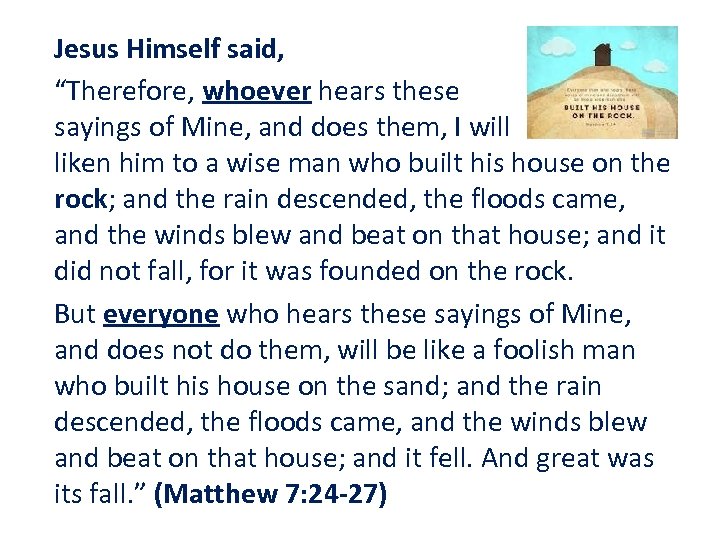 Jesus Himself said, “Therefore, whoever hears these sayings of Mine, and does them, I will liken him to a wise man who built his house on the rock; and the rain descended, the floods came, and the winds blew and beat on that house; and it did not fall, for it was founded on the rock. But everyone who hears these sayings of Mine, and does not do them, will be like a foolish man who built his house on the sand; and the rain descended, the floods came, and the winds blew and beat on that house; and it fell. And great was its fall. ” (Matthew 7: 24 -27)