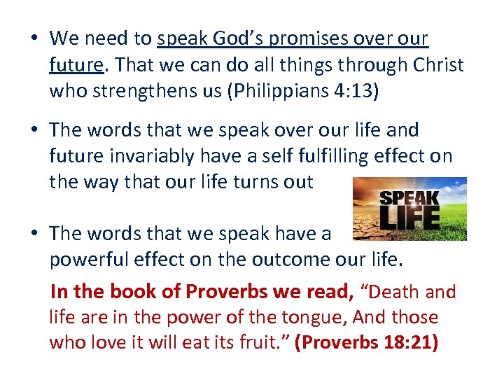 • We need to speak God’s promises over our future. That we can do all things through Christ who strengthens us (Philippians 4: 13) • The words that we speak over our life and future invariably have a self fulfilling effect on the way that our life turns out • The words that we speak have a powerful effect on the outcome our life. In the book of Proverbs we read, “Death and life are in the power of the tongue, And those who love it will eat its fruit. ” (Proverbs 18: 21)