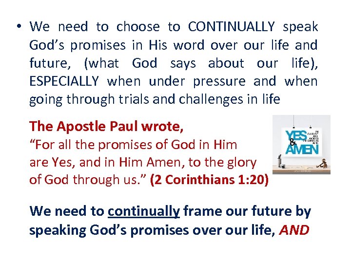 • We need to choose to CONTINUALLY speak God’s promises in His word over our life and future, (what God says about our life), ESPECIALLY when under pressure and when going through trials and challenges in life The Apostle Paul wrote, “For all the promises of God in Him are Yes, and in Him Amen, to the glory of God through us. ” (2 Corinthians 1: 20) We need to continually frame our future by speaking God’s promises over our life, AND