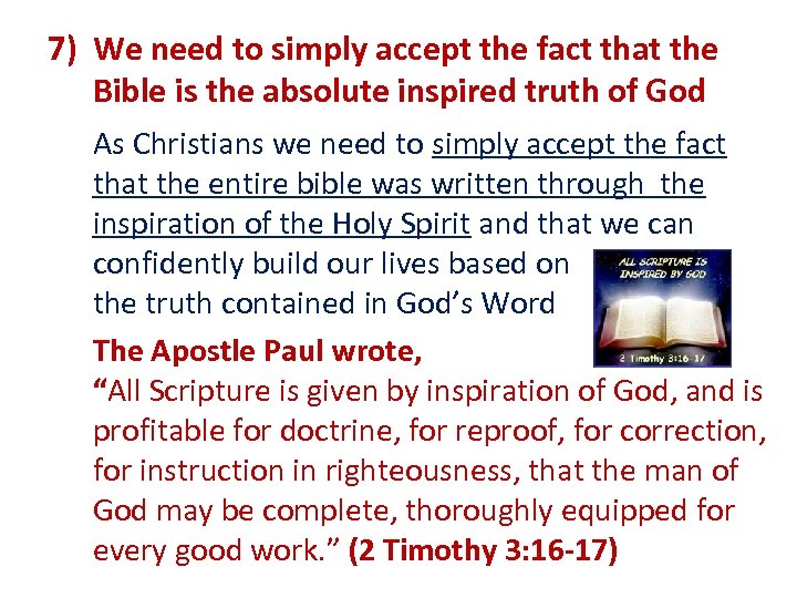 7) We need to simply accept the fact that the Bible is the absolute inspired truth of God As Christians we need to simply accept the fact that the entire bible was written through the inspiration of the Holy Spirit and that we can confidently build our lives based on the truth contained in God’s Word The Apostle Paul wrote, “All Scripture is given by inspiration of God, and is profitable for doctrine, for reproof, for correction, for instruction in righteousness, that the man of God may be complete, thoroughly equipped for every good work. ” (2 Timothy 3: 16 -17)