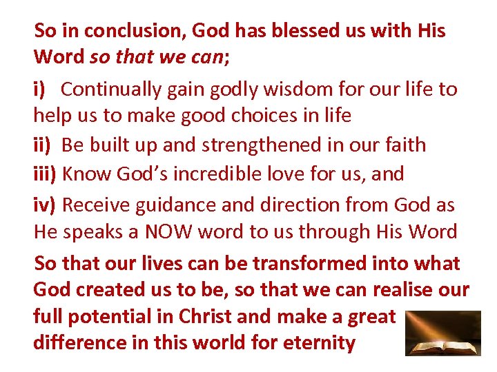 So in conclusion, God has blessed us with His Word so that we can; i) Continually gain godly wisdom for our life to help us to make good choices in life ii) Be built up and strengthened in our faith iii) Know God’s incredible love for us, and iv) Receive guidance and direction from God as He speaks a NOW word to us through His Word So that our lives can be transformed into what God created us to be, so that we can realise our full potential in Christ and make a great difference in this world for eternity