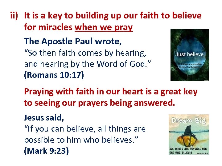 ii) It is a key to building up our faith to believe for miracles when we pray The Apostle Paul wrote, “So then faith comes by hearing, and hearing by the Word of God. ” (Romans 10: 17) Praying with faith in our heart is a great key to seeing our prayers being answered. Jesus said, “If you can believe, all things are possible to him who believes. ” (Mark 9: 23)