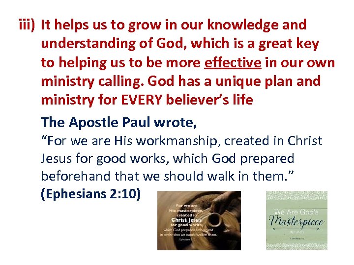 iii) It helps us to grow in our knowledge and understanding of God, which is a great key to helping us to be more effective in our own ministry calling. God has a unique plan and ministry for EVERY believer’s life The Apostle Paul wrote, “For we are His workmanship, created in Christ Jesus for good works, which God prepared beforehand that we should walk in them. ” (Ephesians 2: 10)
