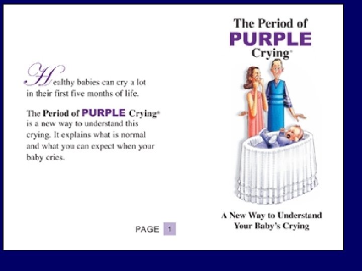 PURPLE Evaluation • Randomized controlled trials – PURPLE booklet & CD • Recruitment prenatally and post-partum • Diary – 24 hr ruler – Infant states (eg, crying) – Parent behavior (eg, holding baby) – Key events: pick up, put down & walk away • Phone interview at 2 months