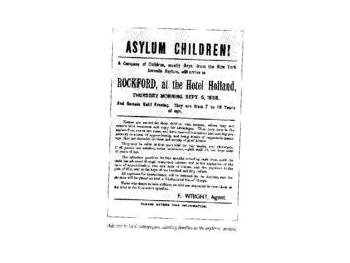 The Solution • Asylums In with the Insane or In Jail • Christian Aid Society A place to live and learn a trade. • Placing Out