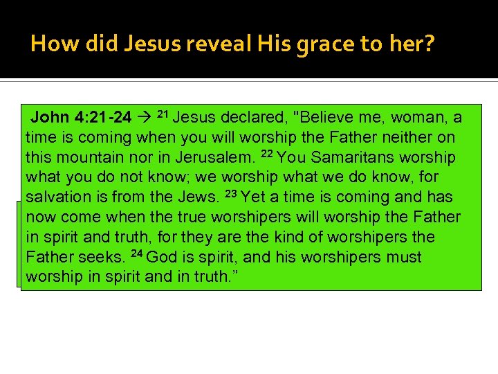 How did Jesus reveal His grace to her? 1. He put Himself in a position of need. John 4: 21 -24 21 Jesus declared, "Believe me, woman, a John 4: 25 -26 25 The woman said, "I know that Messiah" time is coming when you will worship the Father neither on 2. He led with the offer of a gift. (called Christ) "is coming. When he comes, he will explain this mountain nor in Jerusalem. 22 You Samaritans worship 3. He exposed her need for a Savior. everything to us. " 26 Then Jesus declared, "I who speak to what you do not know; we worship what we do know, for 4. He endured & dealt with her you am he. ” salvation is from the Jews. 23 Yet a time is coming and has John 4: 19 -20 19 "Sir, " the woman said, "I can see that now come when the true worshipers will worship the Father deflections. you are a prophet. 20 Our fathers worshiped on this in spirit and truth, for they are the kind of worshipers the mountain, but you Jews claim that the place where we must Father seeks. 24 God is spirit, and his worshipers must worship is in Jerusalem. " worship in spirit and in truth. ”