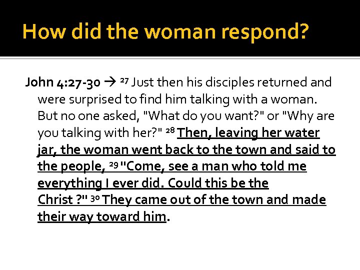 How did the woman respond? John 4: 27 -30 27 Just then his disciples returned and were surprised to find him talking with a woman. But no one asked, "What do you want? " or "Why are you talking with her? " 28 Then, leaving her water jar, the woman went back to the town and said to the people, 29 "Come, see a man who told me everything I ever did. Could this be the Christ ? " 30 They came out of the town and made their way toward him.