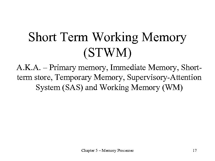 Short Term Working Memory (STWM) A. K. A. – Primary memory, Immediate Memory, Shortterm store, Temporary Memory, Supervisory-Attention System (SAS) and Working Memory (WM) Chapter 5 – Memory Processes 17