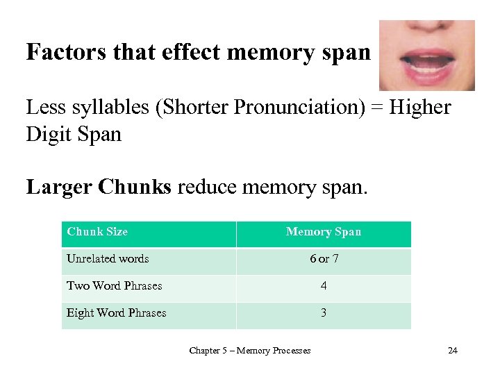 Factors that effect memory span Less syllables (Shorter Pronunciation) = Higher Digit Span Larger Chunks reduce memory span. Chunk Size Unrelated words Memory Span 6 or 7 Two Word Phrases 4 Eight Word Phrases 3 Chapter 5 – Memory Processes 24